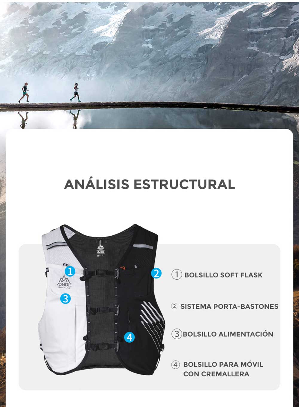 - Bolsillo trasero separado para bolsa de hidratación de hasta 2L, con enganche superior y salida para el tubo.